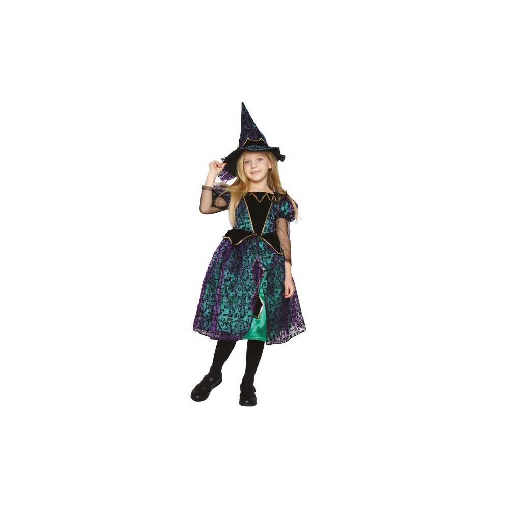 Dětský kostým Čarodějka zeleno-černá je dostupný ve velikostech 3-4 roky, 4-6 let a 7-9 let. Perfektní volba na karneval, Halloween nebo pálení čarodějnic! Kostým je laděný do černé, zelené a zlaté barvy a zahrnuje šaty veselého, střapatého střihu. Ty jsou doplněné o zajímavé černo-zlaté detaily a průhlednou látku s potiskem ornamentů. Šaty mají zapínání vzadu na suchý zip. Čarodějnický kostým doplňuje špičatý klobouk se zlatými detaily a potiskem ornamentů.