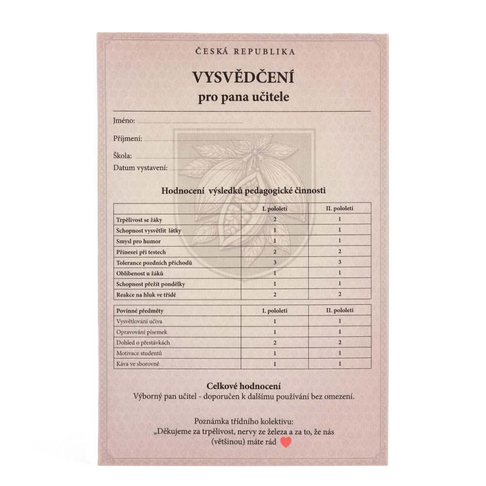 Tentokrát dostane vysvědčení pan učitel – a bude opravdu sladké. Degustační sada čokolád „Vysvědčení“ pro pana učitele je originální dárek, kterým vyjádříte vděčnost za jeho trpělivost, humor i každodenní nasazení. Každý kousek čokolády je malým poděkováním za velkou práci.