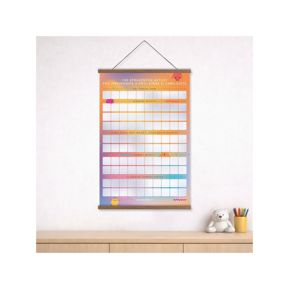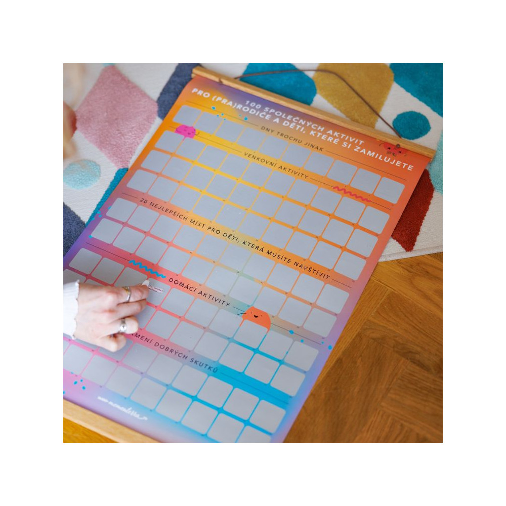 Plakát obsahuje hned 100 originálních tipů na společné zážitky, rozdělených do pěti tematických kategorií – dny trochu jinak, venkovní dobrodružství, nejlepší místa pro děti, která zkrátka musíte navštívit, domácí aktivity a dobré skutky. Díky nim objevíte spoustu nápadů, které vás možná nikdy nenapadly, ale rychle si je zamilujete. Každé políčko ukrývá jednu aktivitu, která vás inspiruje k hravosti, tvoření, objevování i laskavosti – ať už máte chuť na výlet, společné tvoření nebo malý dobrý skutek.