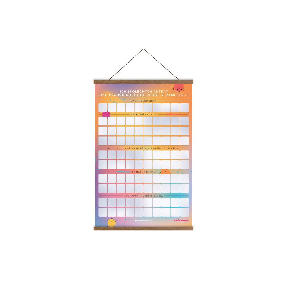 Stírací plakát - 100 aktivit pro (pra)rodiče a děti obsahuje: stírací plakát, dřevěný magnetický rám (41 cm) a stylové škrabátko, které udělá ze stírání ještě větší zábavu.