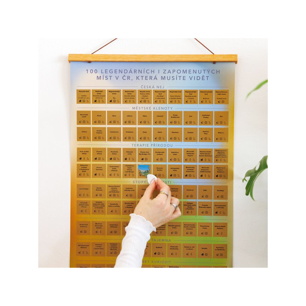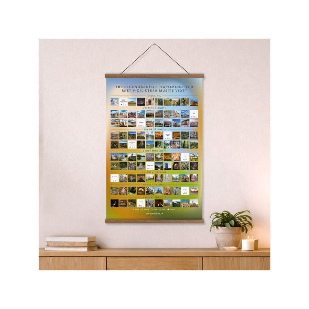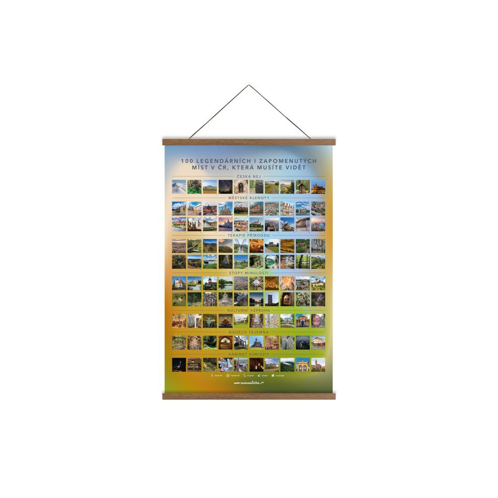 Plakát obsahuje hned 100 originálních cestovatelských tipů, rozdělených do 7 tematických kategorií – česká nej, městské klenoty, terapie přírodou, stopy minulosti, kulturní vzpruha, nádech tajemna a kabinet kuriozit.