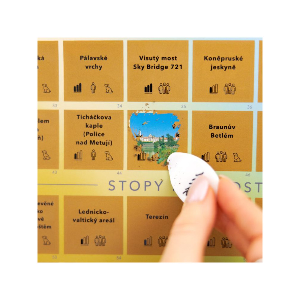 Díky nim navštívíte celou řadu neobvyklých míst, o kterých (už) se příliš nemluví nebo by vás jen tak nenapadly. Na každém políčku pak na vás čekají také piktogramy (obtížnost a počet lidí), které zajistí, abyste si cílovou destinaci vybrali podle své aktuální nálady či fyzické kondice. Pro pejskaře je navíc doplněno info, zda na místo mohou i jejich chlupáči.