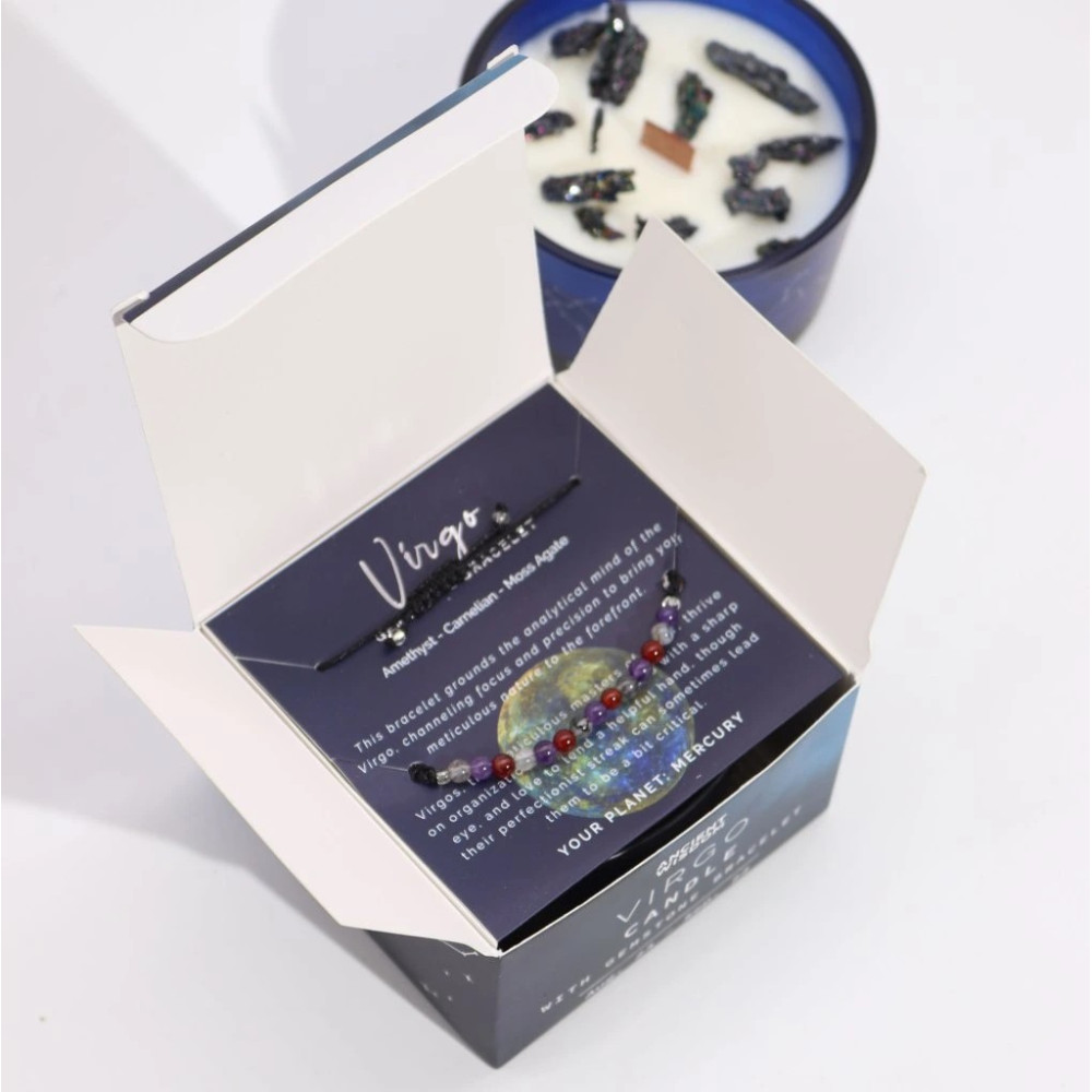 Sada obsahuje náramek z drahých kamenů vyrobený z ametystu, karneolu a mechového achátu, vybraný tak, aby rezonoval s pečujícími a analytickými vlastnostmi Panny. Ametyst zvyšuje jasnost a duchovní vhled a Karneol zvyšuje motivaci a kreativitu. Mechový achát podporuje růst a spojení s přírodou.