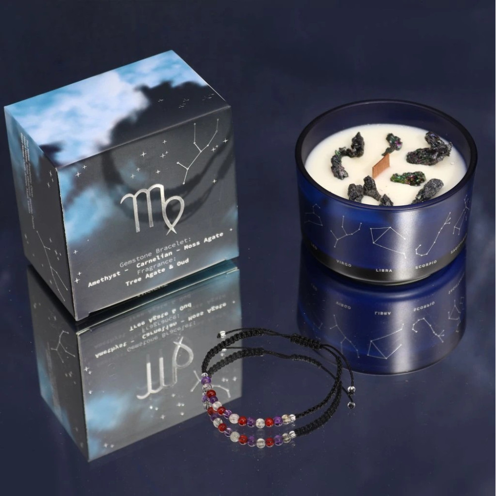 Přijměte praktickou, ale hluboce intuitivní energii Panny s touto křišťálovou svíčkou Zodiac. Zemitá vůně Tree Achát a Oud vytváří uzemněnou, uklidňující atmosféru, která odráží lásku Panny k pořádku, přírodě a rovnováze.