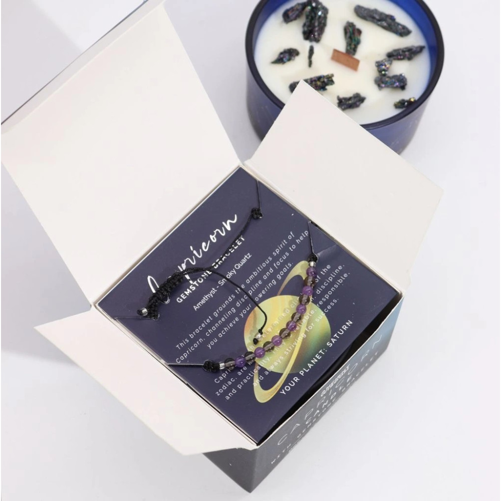 Sada obsahuje náramek z drahých kamenů vyrobený z ametystu a kouřového křemene, který byl vybrán tak, aby podporoval sílu a soustředění Kozoroha. Ametyst podporuje jasnost a duchovní vhled a kouřový křemen nabízí uzemnění a ochranu.