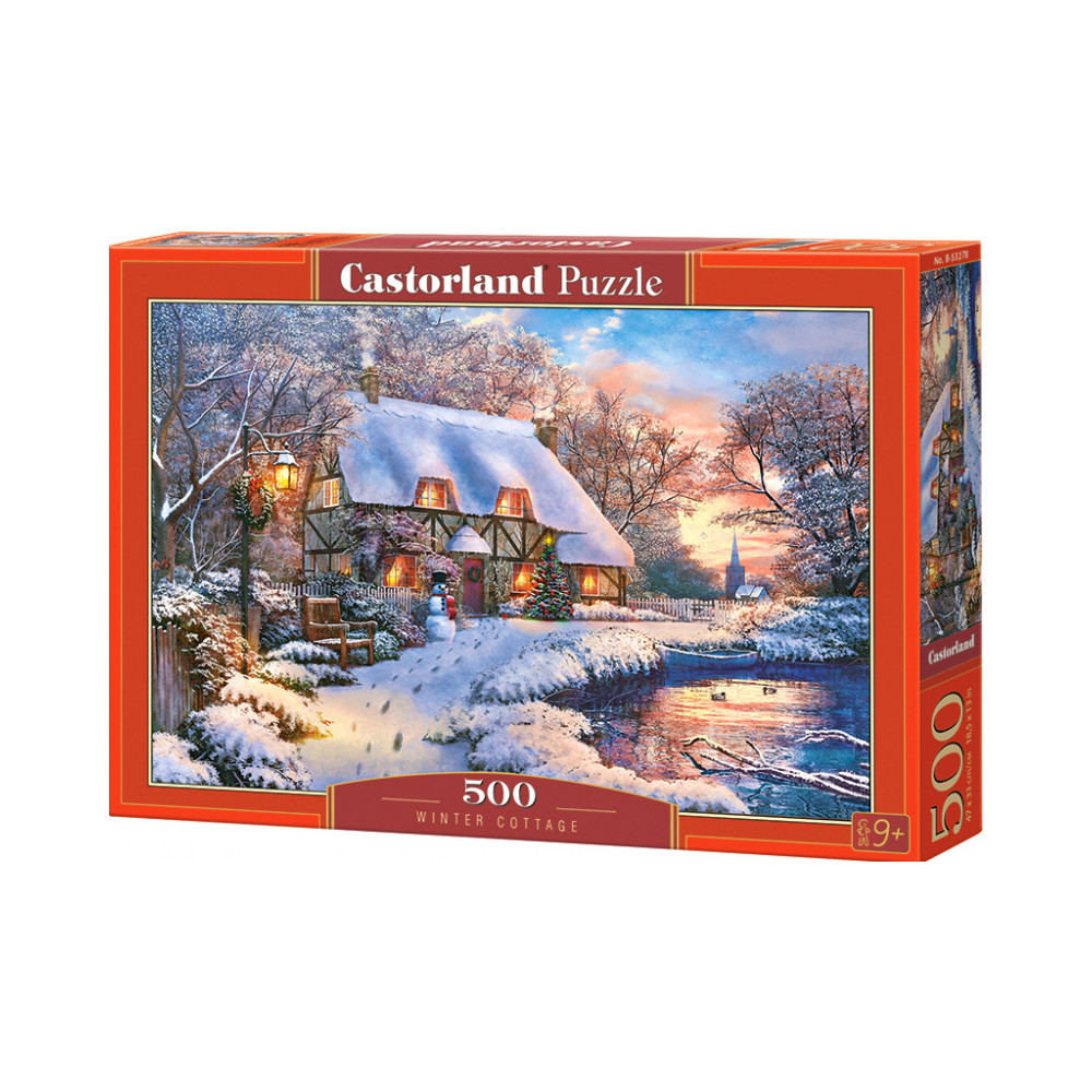 Puzzle od polského výrobce Castorland v obdélníkovém tvaru s krásným motivem zasněžené chaty se zahradou v zimě.