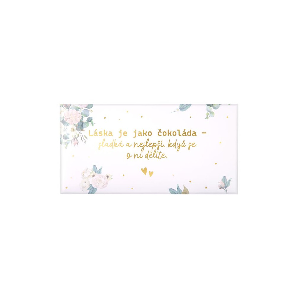 Svatební mléčná čokoláda s mandlemi a malinami. Celou čokoládu zdobí zlatý text na obalu.